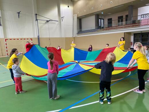 Další cesta vedla do sportovní haly, kde si děti mohly zasportovat a zaskotačit. Každý předškoláček dostal pamětní diplom a na cestu lízátko s motýlkem.